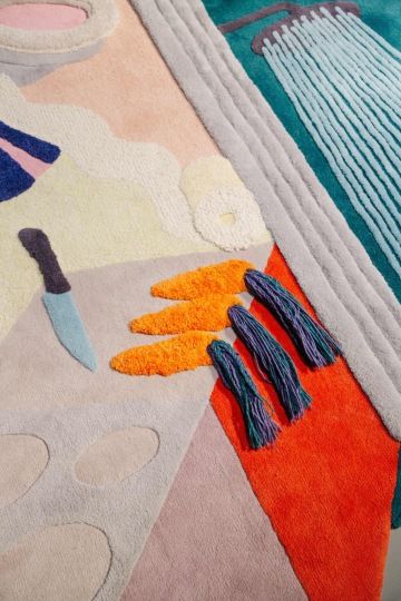 Po dokončení tuftování se plátno zezadu zalatexuje, sundá se z rámu a na řadě je fáze stříhání a začišťování. „Používám nůžky a elektrické strojky, baví mě pracovat s různými výškami chlupu, je to taková měkká sochařina,“ doplňuje designérka. Motiv potom vystřihne, luxusnější kusové koberce i ručně obšívá. Na zadní stranu se lepí ještě ochranná bavlněná vrstva, u tapiserií na zadní stranu lepí desku z překližky.