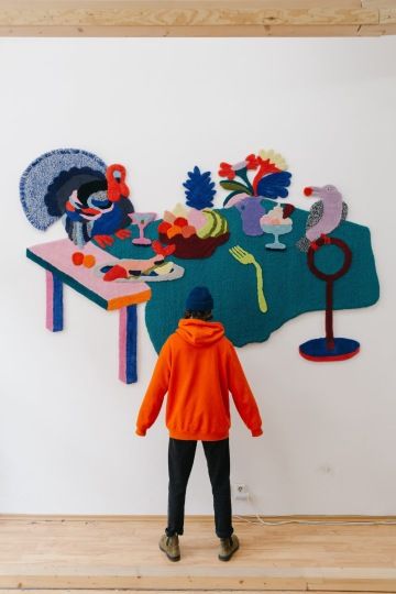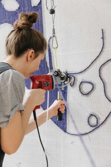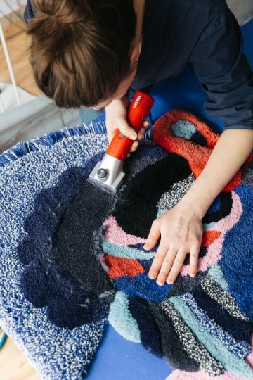 Jak si techniku tuftování konkrétně představit? Anna precizně vypne plátno na rám a překreslí si na něj návrh. Tuftovací pistolí potom nastřeluje přízi, což je při několikahodinové práci fyzicky náročné, už samotná pistole je objemná: „Neustále mačkám spoušť, taky se snažím nehrbit, takže často dřepuju, a pokud pracuju na něčem větším, lezu po žebříku nahoru a dolů,“ vysvětluje designérka.