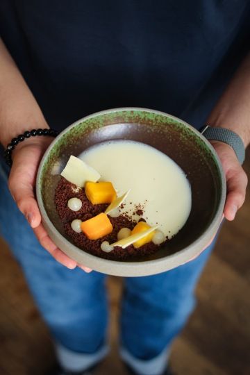 Bergamotová panna cotta s bílou čokoládou, kakaovým crumblem a mangem