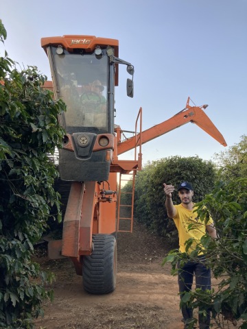 Mezitím už na farmě probíhá sběr pomocí speciálních kombajnů, které z kávovníků očešou zralé třešně prostřednictvím natřásání. Tyto kombajny pak během dne nepřetržitě vozí třešně do zpracovatelských zařízení, v nichž se káva zpracovává od rána do večera.