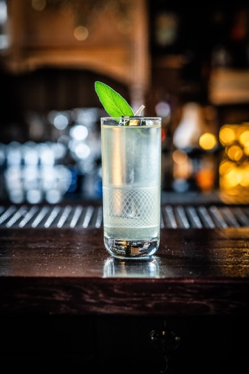 Všechny ingredience nadávkujeme do shakeru, přidáme led a šestkrát rolujeme (házíme), přelijeme na kostky ledu do highball skleničky a ozdobíme snítkou šalvěje.