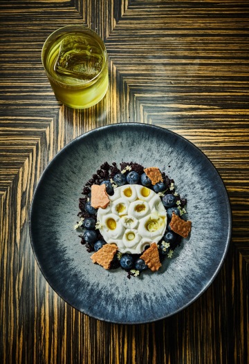 Igor: Tento skvělý digestiv dodává sladkému dezertu hořkou chuť, to mě na tom baví. Gin z jehličí se propojí se smrkovým olejem, který perfektně ladí s borůvkami.