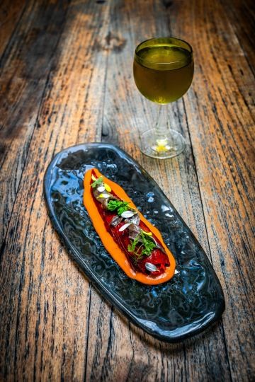 Druhé jídlo, grilované papriky s paprikovou espumou a ančovičkou, nese veškerou slanost a lehkou kouřovost španělské kuchyně. K němu Vojta postavil koktejl s bílým vínem, sherry a likérem z dýňových semínek. Je lehký, suchý, se slaným dozvukem a bylinným akcentem, ale ne nevýrazný. Tón v tónu, ale s kontrastem textur.