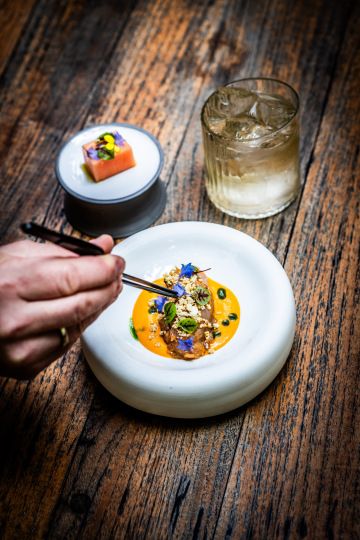 Sortiment se za osm let výrazně rozšířil. Kromě whisky a bourbonu tu najdete široký výběr mezcalů, ginů, přírodních vín i Champagne. Každé nové menu vzniká v úzké spolupráci celého týmu a je výsledkem dlouhodobého hledání a testování.