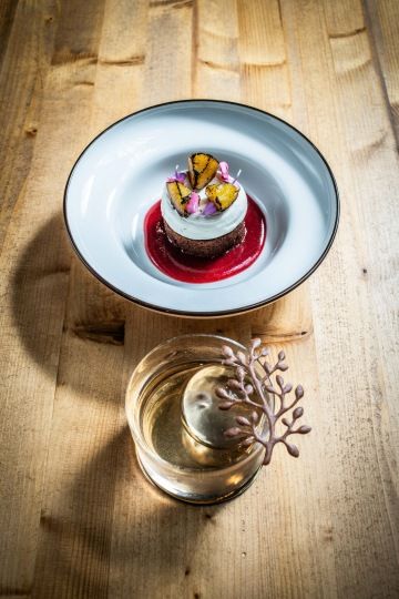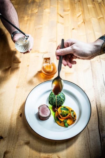 Jirka Vošahlík přistoupil k párování s jasnou logikou. Úvodní chod si žádal lehký aperitiv s fortifikovanými víny a umami linkou, která otevírá zemité houbové ragú s pošírovaným vejcem a topinamburovou pěnou. Hlavní jídlo s vepřovou panenkou zabalenou ve schwarzwaldské šunce, již doplňuje šalvějové jus, dýňové pyré a kapusta plněná domácím sýrem, naopak dovolilo sáhnout po intenzivnější variaci na Old Fashioned s rumem, medem a kardamomem, kterou odlehčil verjus. A závěrečný dezert s perníkem a švestkami doplnil koktejl s umeshu a lískovým oříškem zjemněný mléčnou klarifikací. Kouřový nádech drinku podporuje hřejivost perníku, zatímco oříšková linka ukotvuje švestky. Závěr tak nepůsobí těžce ani přeslazeně, ale harmonicky a lehce.