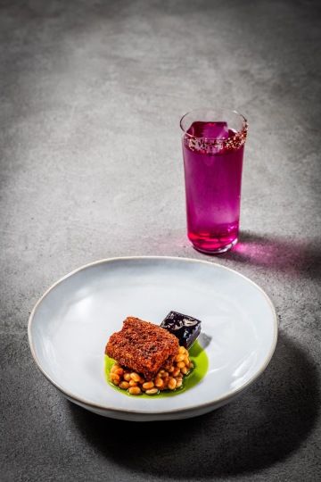 Václav: Koktejl má jemnou kouřovost, ale díky karbonizaci a minerální vodě je lehký a svěží. Svěžest drinku vyvažuje plnost chorizové strouhanky a fazolí, nakládané zelí a fermentovaná řepa zvýrazňují jeho pikantní tóny.