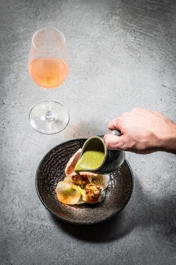Druhý chod si přímo říkal o minerální bílé víno, a tak Filip sáhl po Pinotu Grigio a zkombinoval ho s čerstvými jahodami. Pro větší hloubku chutí přidal aquavit, jehož tóny kopru a kmínu rezonují se špenátovým velouté a nakládanou kedlubnou. Výslednou kompozici doladil minerální cordial, jenž propojuje víno s mořskými plody a zároveň zvýrazňuje máslovost mušlí.