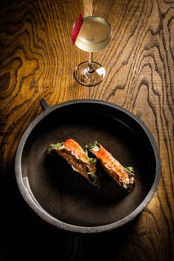 Tomáš: Aperitivní styl drinku, útočící na všechny chuťové pohárky. Drink je krátký, suchý, citrusový a lehce slaný po olivovém nálevu, který hezky doplňuje sladkou ricottu v pokrmu. Kombinace meruňkovice s citronovou kůrou vyvažuje chuť dominantní syrové krevety. Kůže yuzu s campari doplňuje suchost a aroma kakaa. Nastartuje jazyk a připraví ho na další chod.