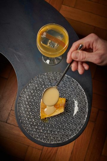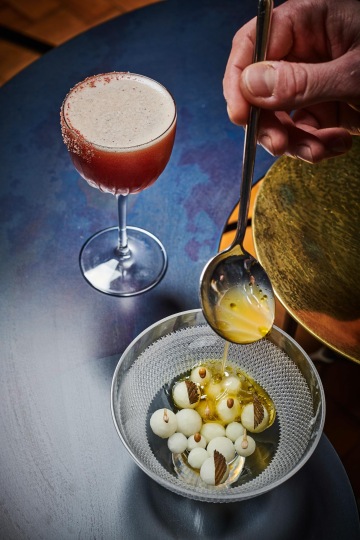 Vojta: K rybě je slané sherry volbou téměř najistotu. Ozvláštní to citronová tráva, která dává koktejlu nádech svěžesti. Heřmánek s bylinným likérem hrají k podávané omáčce duo rozdílných, avšak komplementárních chutí.