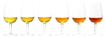 Jste připraveni, takže můžeme začít s vlastní degustací. Nalijte si do sklenky degustační vzorek (0,02 l – uvědomte si, že při průměrné degustaci ochutnáváte 4–8 vzorků, což při tomto objemu činí 0,8–1,6 dcl destilátu o minimální síle 40 % alkoholu) a začněte. Sklenku uchopte a pozdvihněte. Nápojem v ní však nekružte. Proč? Protože whisky není víno, které má 11 až 15 % alkoholu, ale destilát, který má alkoholu minimálně 40 %. Při zakroužení byste zintenzivnili proudění a přednostně uvolnili volně těkavé látky, čímž byste okamžitě lehce pozměnili aromatické spektrum nápoje, a výsledné aroma by tak bylo velmi výrazné, s převažujícími agresivními tóny. Naopak, zakružte sklenkou kolem nápoje tak, aby se hladina pokud možno co nejméně pohnula a vy jste pokryli stěny sklenky tenkým filmem z whisky. Tím lehce „zawhiskujete“ sklo a nenásilně zvětšíte plochu odparu. Whisky se vám tudíž odpařuje z mnohem větší plochy, a tím pádem podstatně intenzivněji.