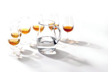Dále věnujme pozornost výběru sklenky. Stejně jako například u vína je i u whisky tvar sklenky velmi důležitý. Ovlivňuje, jakým způsobem se budou jednotlivé části aromatického spektra uvolňovat a atakovat vaše čichové buňky. Nutno říci, že tumbler (neboli whiskovka) není zrovna šťastné řešení. Proč? Stačí se podívat na její tvar. Široké dno, stejně široké hrdlo, relativně nízký profil. Na degustaci whisky není nic nevhodnějšího (snad kromě talíře) než právě tumbler (nicméně pro některé koktejly, případně pro nezávazné popíjení whisky je naprosto v pořádku). Po nalití degustačního vzorku s bídou pokryjeme dno tohoto typu sklenice. Hladina, z níž se odpařuje aroma, tu má velkou plochu. To by samo o sobě nevadilo. Naopak, dávalo by to komplexnější a mohutnější požitek z aroma. Ale to by nesmělo být současně široké i hrdlo… U tohoto typu sklenek tomu tak ovšem je. Dochází v nich proto k velmi rychlé oxidaci nápoje, a tím i k velmi rychlému „vyčpění“. Navíc whisky je tvořena nejen etanolem a vodou, ale též desítkami dalších chemických sloučenin, které jsou významnými nositeli organoleptických vlastností nápoje. Každá z těchto sloučenin má jiné chemické a fyzikální vlastnosti. A tak zatímco se některé při odpařování drží u stěny sklenky, jiné se hrnou ven středem. Stačí nalít si degustační vzorek do tumbleru a okamžitě to poznáte. Přivoňte si k okraji sklenky a ke středu. Okamžitě ucítíte lehký aromatický posun. Výsledkem je, že prakticky nemáte šanci vnímat komplexní aroma, ale pouze jeho jednotlivé části. A to navíc jen po velmi krátkou dobu.