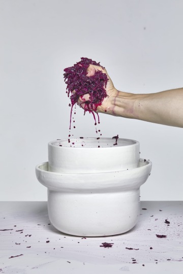 Karolína při této příležitosti navrhla nádoby na uchování a kvašení potravin vodní hladinou. Tento způsob uchovávání jídla znaly naše prababičky v době, kdy vymoženost lednice byla ještě v nedohlednu. V současnosti, kdy kvašení a fermentace zažívá renesanci stejně jako návrat k tradičním hodnotám a k životu bez plastu, jsou tyto postupy opět velice aktuální. Karolíniným parťákem, jak ho s úsměvem nazývá, byl pan Karel Hanák z Násedlovic na Hodonínsku. Poté, co z nejrůznějších důvodů sešlo z původního plánu odlévání do forem, zasedl zkušený hrnčíř za kruh a nádoby vytočil. Vznikla máslenka a zelák.