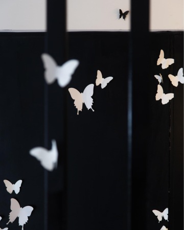 Kromě lineárních černých prvků převládají u nábytku a dalšího interiérového vybavení plochy v odstínu přírodního dubu. Akcentní je pak modrá plocha dřevěného obložení čela baru, doplněná hejnem žlutých origami ptáčků pod stropem bistra a solitéry zeleně v neglazovaných hliněných nádobách. V nočních hodinách je plocha baru navíc doplněna nasvícením zdi v zadní části taverny modrým světlem. Povětšinou ale světlo dává pouze decentně vyniknout povaze nasvícených materiálů.