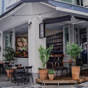 Apiri_greek eatery je ukázkovým zástupcem řeckého bistra v přístavním městě. S tisíci podobných podniků jej spojuje umístění na nároží úzké zastíněné uličky i propojení interiéru s uličním prostorem. Vzduch z ulice interiérem doslova profukuje.
