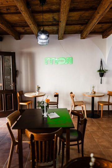 Výborná výběrová káva, vlastní sladké i slané pečivo, nápadité brunche a lokální funky naturální vína. Tím vším se může chlubit MOJI café v Mikulově. Název odkazuje nejen k zájmenu „moji“ (můj), ale je také složeninou jmen Monika a Jirka, manželského páru, který se po letech podnikání na pražské gastronomické scéně přesunul zpět na Moravu. Základ podniku tvoří káva z lokálních pražíren a samozřejmě víno. Vždyť jsme v Mikulově. Nabídku jídel definuje sezónnost a lokálnost. Některé suroviny si zde vyrábí sami, například kimči, miso karamel nebo fermentovaný květák. Za podobou interiéru též stojí přímo majitelé – chtěli totiž, aby podnik po všech stránkách reprezentoval je dva.