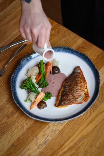 Na libovolný talíř naskládáme zeleninu, vedle položíme filet pražmy a zalijeme škumpovou omáčkou.