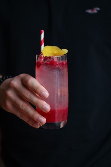 Na dno sklenice nalijeme malinové pyré, vložíme brčko a zasypeme kostkami ledu až po okraj. V šejkru smícháme pár kostek ledu s ginem, čajem ze škumpy, citronovým freshem a cukrovým rozvarem. Pořádně protřepeme a opatrně pomocí straineru lijeme po ledových kostkách do sklenice tak, aby pyré zůstalo oddělené. Ozdobíme kůrou z citronu, podrcenými zmrzlými malinami a máme hotovo. Na zdraví!