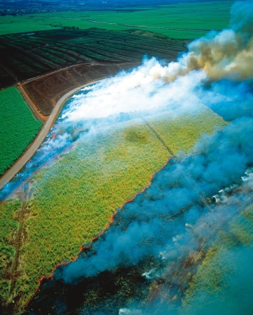 Sklizeň cukrové třtiny trvá 4–5 měsíců. Rostliny se na plantáži nejdříve opálí, a to hned ze dvou důvodů. V první řadě je nutné se zbavit spodních listů. Na mnoha místech na světě se cukrová třtina totiž dosud sklízí ručně pomocí speciálních mačet. Rostlinu je třeba odseknout co nejníže u země, a pokud by se listy neopálily, mačeta by po nich klouzala. Druhým důvodem opalování rostlin je skutečnost, že třtině na plantážích dělají společnost hadi – a právě ty oheň zažene. Po zapálení pole se počká, až rostliny ohoří, a teprve pak přicházejí v obtížně dostupném terénu lidé s mačetami a na snadno přístupných plantážích stále častěji speciální sklízecí stroje.